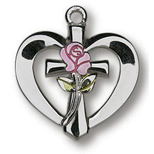 This genuine sterling silver heart cross comes on a light weight 18 inch silver chain. Deluxe gift boxed. Heart measures 1/2 inch tall. Features a painted rose center.
