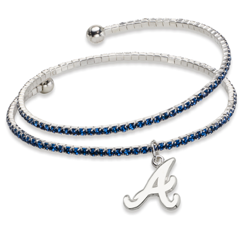 The Atlanta Braves wrap-around bangle features a silver tone finish and has a spiraling row of glittering blue crystals. The coil design wraps easily around every size wrist and has silver tone round beads to finish the tips of each end. Adorned with a Braves team charm. Import.