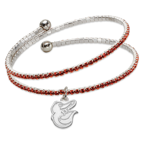 This Baltimore Orioles wrap-around bangle features a high powered silver tone finish and has a spiraling row of glittering crystals that matches your team's color. The coil design wraps easily around every size wrist and has silver tone round beads to finish the tips of each end. Adorned with a stylized team charm, eye catching in its own right, adds a signature detail that will provide energy and excitement to any outfit!