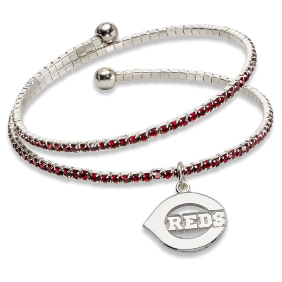 Bring it and bring it on strong! Amp up the love for your Cincinnati Reds by wearing the Amped bracelet and love your team out loud! This wrap-around bangle features a high powered silver tone finish and has a spiraling row of glittering crystals that matches your team's color. The coil design wraps easily around every size wrist and has silver tone round beads to finish the tips of each end. Adorned with a stylized team charm, eye catching in its own right, adds a signature detail that will provide energy and excitement to any outfit!