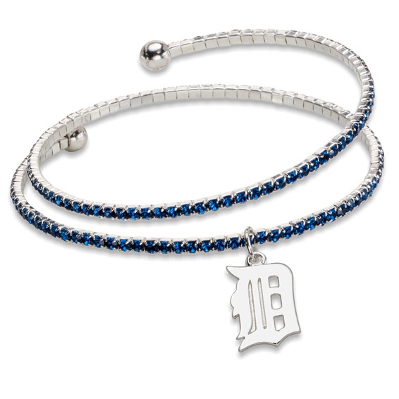 This Detroit Tigers wrap-around bangle features a high powered silver tone finish and has a spiraling row of glittering blue crystals. The coil design wraps easily around every size wrist and has silver tone round beads to finish the tips of each end. Adorned with a stylized team charm, eye catching in its own right, adds a signature detail that will provide energy and excitement to any outfit!