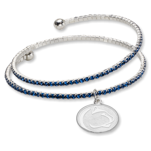 Bring it and bring it on strong! Amp up the love for Penn State University by wearing the Amped bracelet and love your team out loud! This wrap-around bangle features a high powered silver tone finish and has a spiraling row of glittering crystals that matches your team's color. The coil design wraps easily around every size wrist and has silver tone round beads to finish the tips of each end. Adorned with a stylized team charm, eye catching in its own right, adds a signature detail that will provide energy and excitement to any outfit!
