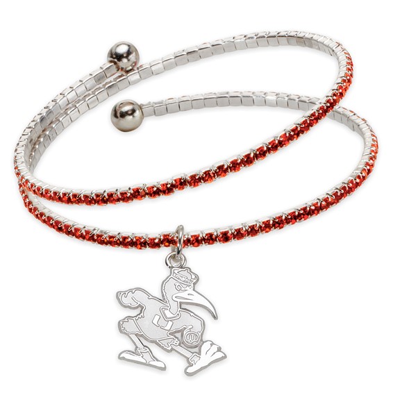 Amp up the love for the University of Miami Florida by wearing the amped bracelet. This wrap-around bangle features a high powered silver tone finish and has a spiraling row of glittering orange crystals. The coil design wraps easily around every size wrist and has silver tone round beads to finish the tips of each end. Adorned with a stylized team charm, eye catching in its own right, adds a signature detail that will provide energy and excitement to any outfit!