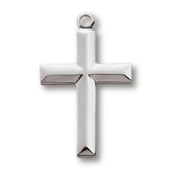 This genuine stering silver Latin beveled cross comes on a medium weight 18 inch stainless steel chain. Deluxe gift boxed. Cross measures 3/4 inch tall.