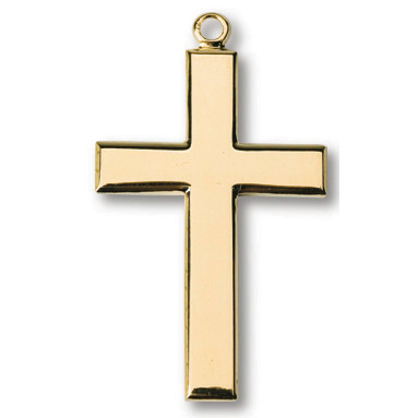 This 18k gold-plated sterling silver polished Latin cross comes on a heavy weight 24in stainless steel chain. Cross measures 1in tall. Deluxe gift boxed.