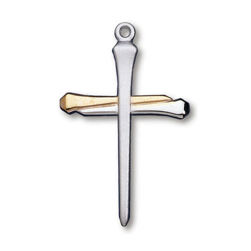 This genuine stering silver nail cross comes on a heavy weight 24 inch stainless steel chain. Deluxe gift boxed. Cross measures 1 1/4 inches tall. Features gold plated nail.
