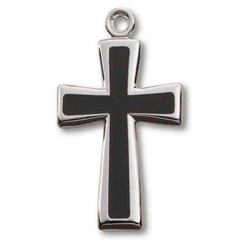 This genuine stering silver Crusader cross comes on a heavy weight 24 inch stainless steel chain. Deluxe gift boxed. Cross measures 1 1/4 inches tall. Features a black enamel center.