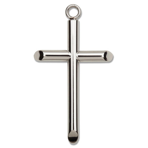 Barrel cross featuring tapered edges. Made of the highest quality 316L stainless steel. Will not rust or tarnish and is naturally hypoallergenic. 24 inch fancy stainless steel oval ball chain included. Deluxe gift boxed. Cross measures 1 1/4 inches tall.