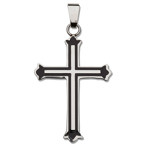 This men's budded cross is made of black enamel and 316L stainless steel. It comes with a 24 inch stainless steel ball chain. Cross measures 1 3/16 inches tall. Deluxe gift boxed.
