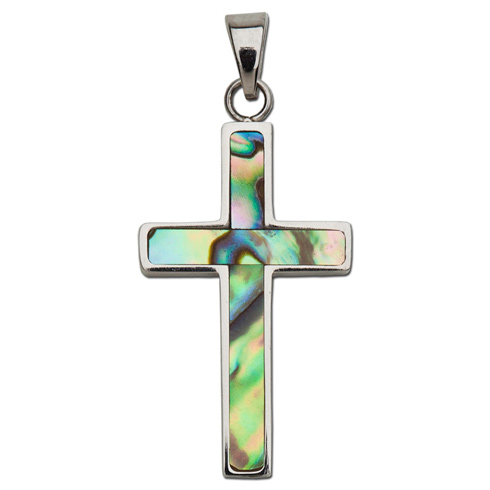 This ladies' stainless steel Latin cross features a genuine abalone inlay. Cross measures 1 inch tall. 18 inch stainless steel silver plated ball chain is included. Ball chain width: 1mm. Deluxe gift boxed.
