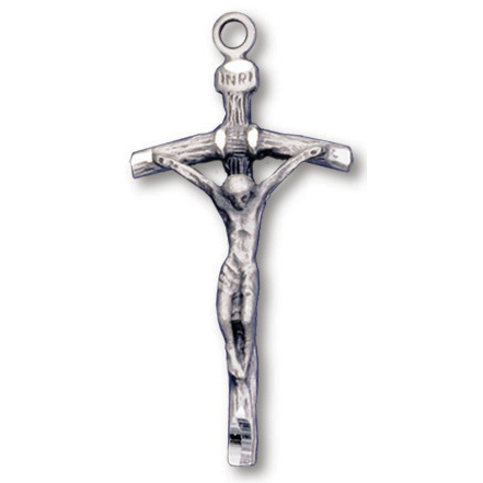 This 1 1/4 inch tall naturalistic crucifix pendant is made of sterling silver. 18 inch medium weight stainless steel chain included. Deluxe gift boxed.