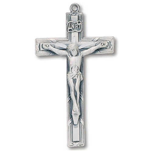 This large 1 5/8 inch tall Latin cross crucifix pendant is made of sterling silver. 24 inch heavy weight stainless steel chain included. Deluxe gift boxed.