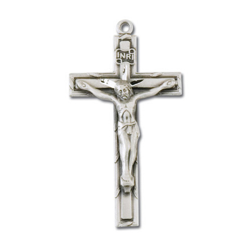 This 1 1/4 inch tall Latin cross crucifix pendant is made of sterling silver. 18 inch medium weight stainless steel chain included. Deluxe gift boxed.