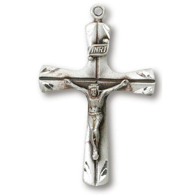 This 1 1/8 inch tall scalloped cross Crucifix pendant is made of sterling silver. 24 inch heavy weight stainless steel chain included. Deluxe gift boxed.