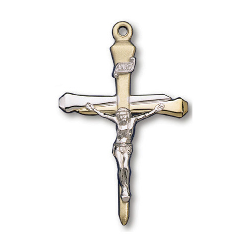 This 1 1/4 inch tall spike nail cross Crucifix pendant is made of 18kt yellow gold over sterling silver. 24 inch heavy weight stainless steel chain included. Deluxe gift boxed.