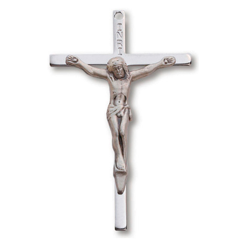 This men's large thin modern cross INRI crucifix pendant is made of sterling silver. Pendant height: 1 1/2 inch. 24 inch heavy weight stainless steel chain included. Deluxe gift boxed.