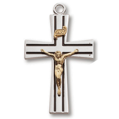 This 1 1/8 inch tall enamel striped cross Crucifix pendant is made of sterling silver. 24 inch heavy weight stainless steel chain included. Deluxe gift boxed.