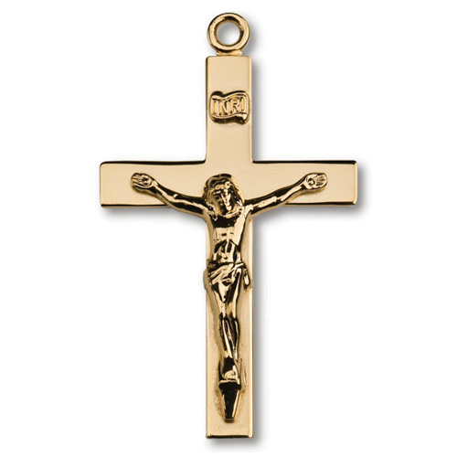This 1 1/2 inch tall modern cross Crucifix pendant is made of 18kt yellow gold over sterling silver and features the Lord's Prayer on the back. 24 inch heavy weight stainless steel chain included. Deluxe gift boxed.