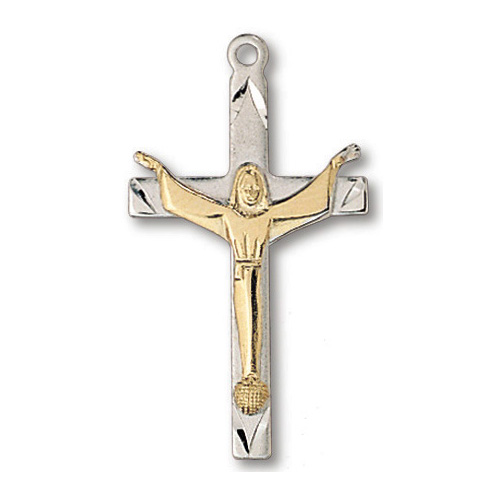This 1 1/4 inch tall Christ is Risen pendant is made of sterling silver and features 18kt yellow gold plated accents. 24 inch heavy weight stainless steel chain included. Deluxe gift boxed. Made in USA.