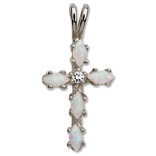 This 5/8 inch tall cross pendant is made of sterling silver and features genuine opals and a cubic zirconia center. 18 inch light weight silver chain included. Deluxe gift boxed.