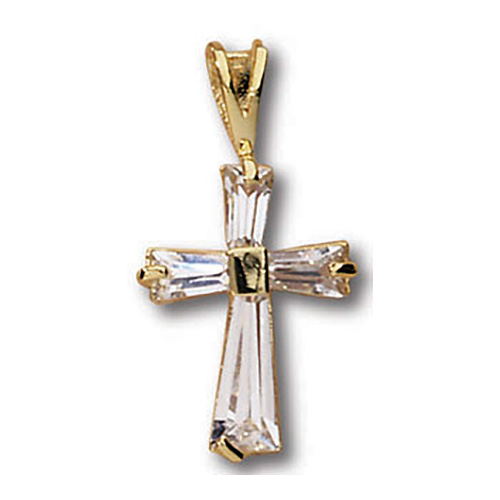 This 11/16 inch tall cross pendant is made of 18kt yellow gold plated over sterling silver and features baguette cubic zirconias. 18 inch light weight gold plated chain included. Deluxe gift boxed.