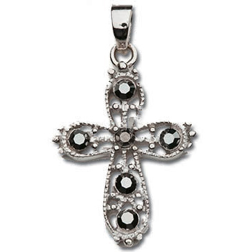 This 7/8 inch tall cross pendant is made of sterling silver and features dark cubic zirconias. 18 inch light weight silver chain included. Deluxe gift boxed.