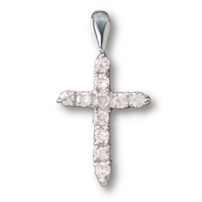 This 5/8 inch tall cross pendant is made of sterling silver and features white crystal stones. 18 inch light weight silver chain included. Deluxe gift boxed.