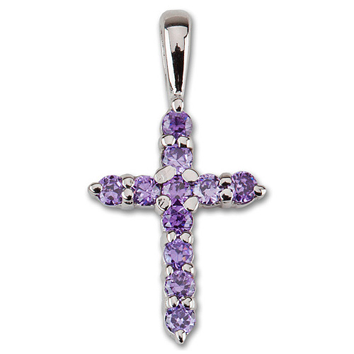 This 5/8 inch tall cross pendant is made of sterling silver and features amethyst crystal stones. 18 inch light weight silver chain included. Deluxe gift boxed.