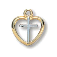 This 3/8 inch tall heart cross pendant is made of 18kt yellow gold over sterling silver. 16 inch light weight gold plated chain included. Deluxe gift boxed.