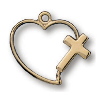 This 7/16 inch tall heart cross pendant is 18kt yellow gold filled. 18 inch light weight gold plated chain included. Deluxe gift boxed.