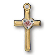 This 1/2 inch tall cross pendant is 14kt yellow gold filled and features a heart center. 16 inch light weight gold plated chain included. Deluxe gift boxed.