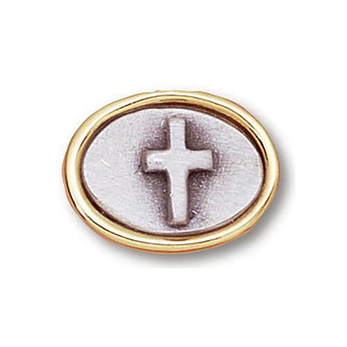 This 1/2 inch tall oval cross tie tac is made of pewter plated in gold. Deluxe gift boxed.