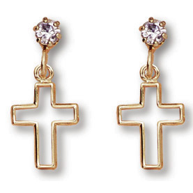 These 3/4 inch tall cross dangle earrings are 14kt yellow gold filled and feature crystal stones. Deluxe gift boxed.