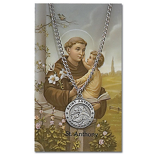 This genuine pewter Saint Anthony medal is on a 24 inch pewter chain with matching laminated holy card. Card measures 2 3/4 inches by 4 1/2 inches.