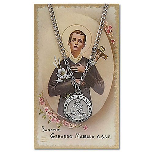 This genuine pewter Saint Gerard medal is on a 18 inch pewter chain with matching laminated holy card. The round St Gerard medal is 3/4in x 3/4in, the size of a penny. Card measures 2 3/4 inches by 4 1/2 inches.