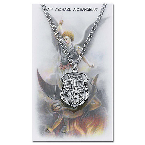 This genuine pewter Saint Michael Police medal is on a 24 inch pewter chain with matching laminated prayer card. Card measures 2 3/4 inches by 4 1/2 inches.