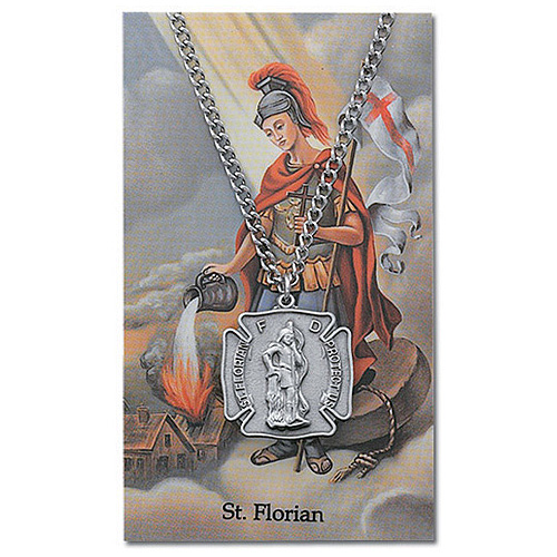 This genuine pewter Saint Florian firefighter medal is on a 24 inch pewter chain with matching laminated prayer card. Medal size: 1in x 1in. Card measures 2 3/4 inches by 4 1/2 inches.