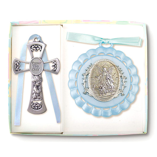 This boy's baby room gift set includes a guardian angel ornament and 3 1/2 inch Bless This Child pewter cross with blue ribbon.