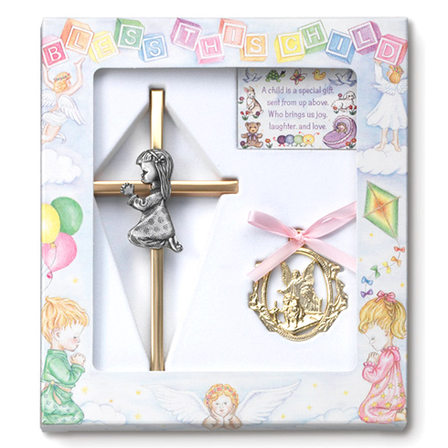 This boy's baby room gift set includes a guardian angel ornament with pink ribbon and 6 inch tall bright finished metal cross with praying pewter finished girl figure. Message card included.