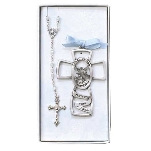 This boy's baby room gift is a 3 inch tall pewter cross engraved with Angel of God Protect this Child and a rosary with a blue ribbon.