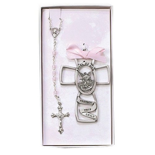 This girl's baby room gift is a 3 inch tall pewter cross engraved with Angel of God Protect this Child and a rosary with a pink ribbon.