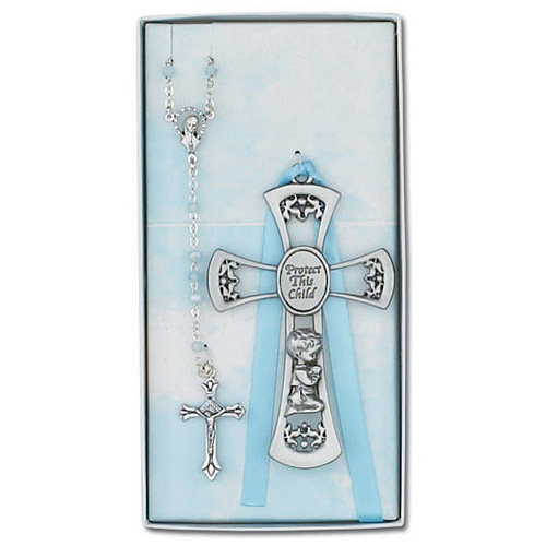 This boy's baby room gift is a 3 1/2 inch tall pewter cross engraved with Bless this Child and a rosary with a blue ribbon.