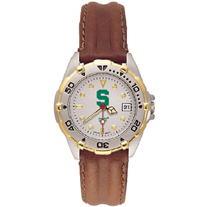 Go Spartans! Stylish brushed chrome finish case with a rotating two-tone bezel and matching brown leather bracelet. The All-Star features a precision Miyota® quartz movement, distinguished dial face, with the team logo on the top half and team name on lower half of dial, date window, raised lMISinous hour, minute and second hands, and the crystal is mineral glass. Water resistant. Packaged in an attractive silver tin. Two year limited warranty.