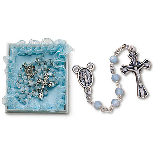 This boy's first deluxe rosary features 4mm round shaped blue glass beads and a genuine pewter crucifix and center in a blue box.