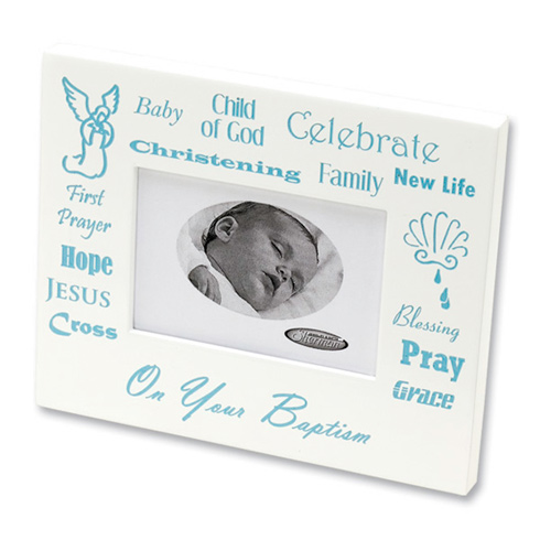 White wooden On Your Baptism picture frame for boys with laser cut blue painted lettering. Measures 5 1/8 by 6 1/4.