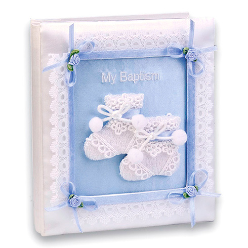 Blue My Baptism photo album for boys holds 100 photos that measure 4 by 6 inches.