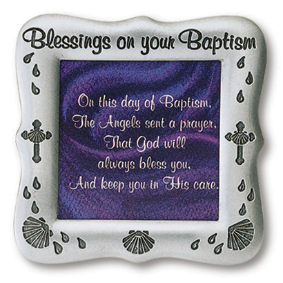 Blessings on your Baptism picture frame with a pewter finish. Measures three inches. Message can be replaced by a photo.