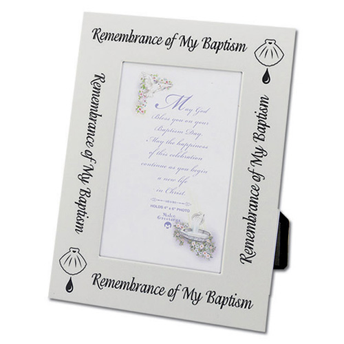 This satin silver metal finish picture frame has two shell engravings and Remembrance of My Baptism engravings. Measures 5 by 7 inches.