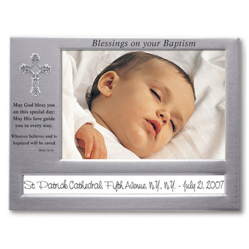 This satin silver metal picture frame features a cross and the engravings: Blessings on your Baptism. May God bless you on this special day; May his love guide you in every way. Includes a space for a personalized hand written message. Measures 6 by 8 inches. Holds pictures 4in x 6in.