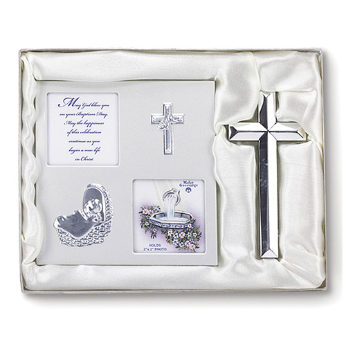 This satin silver metal finished picture frame features a cross and baby basket. Measures 4 3/4 by 4 3/4 inches. Holds two photos. Also comes with a 4 1/2 inch tall bright silver finished cross.